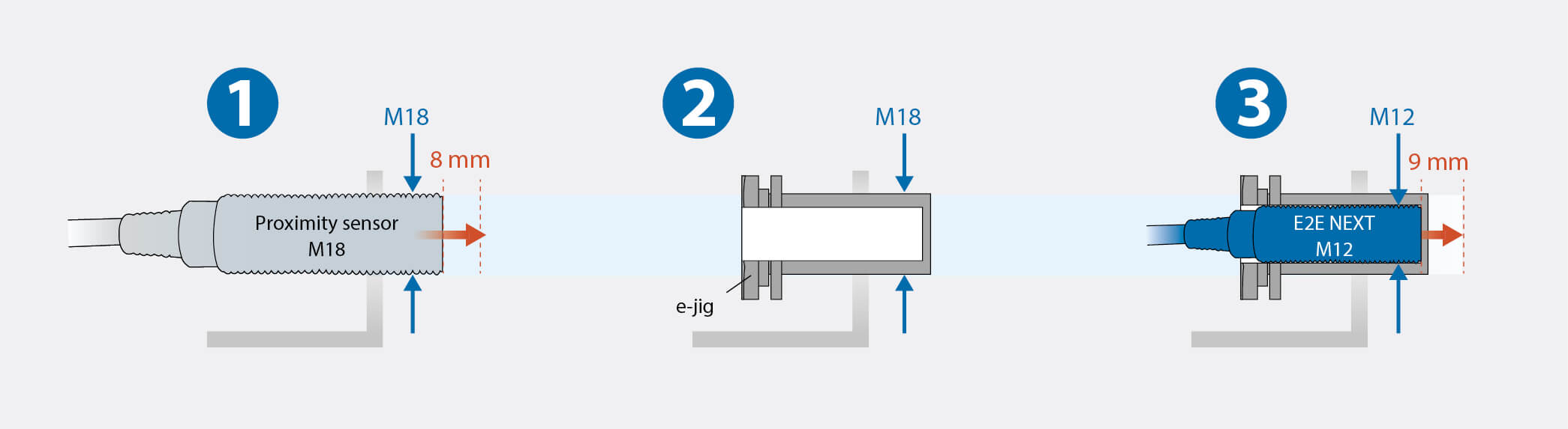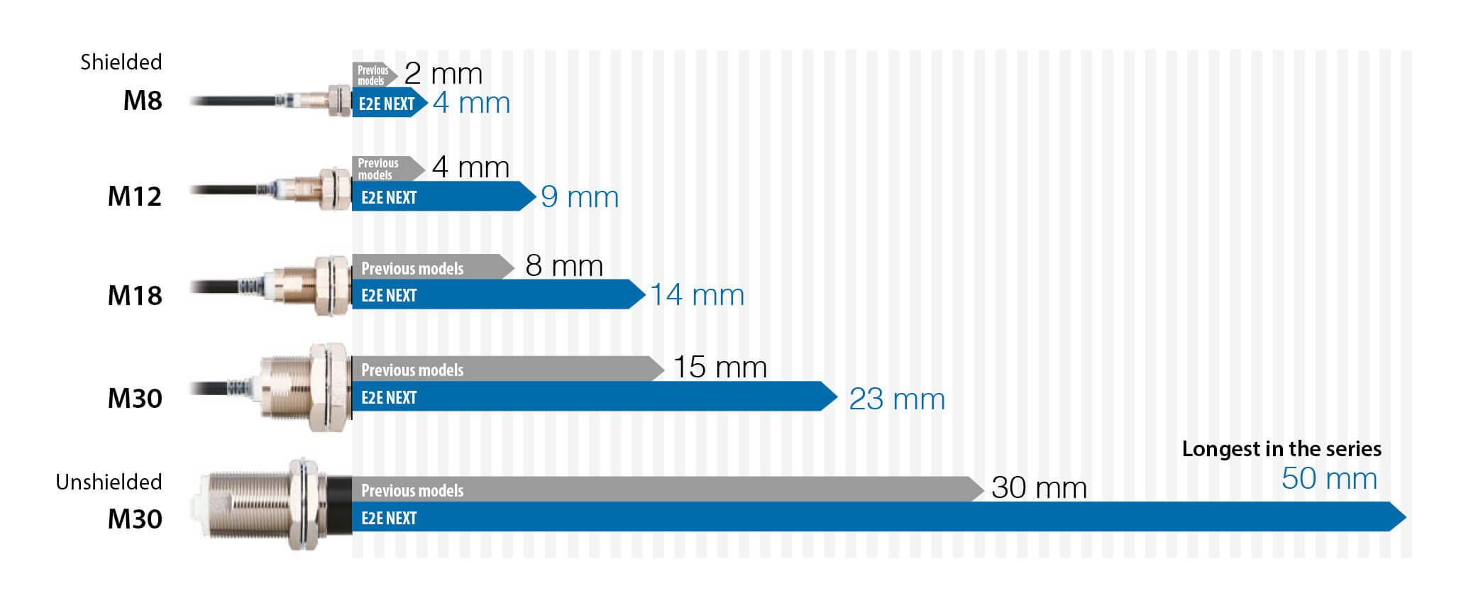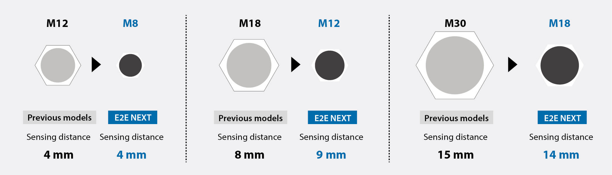 Сравнение размеров моделей с одинаковой дистанцией срабатывания («E2E NEXT» относится к моделям с увеличенной в 4 раза дистанцией срабатывания)