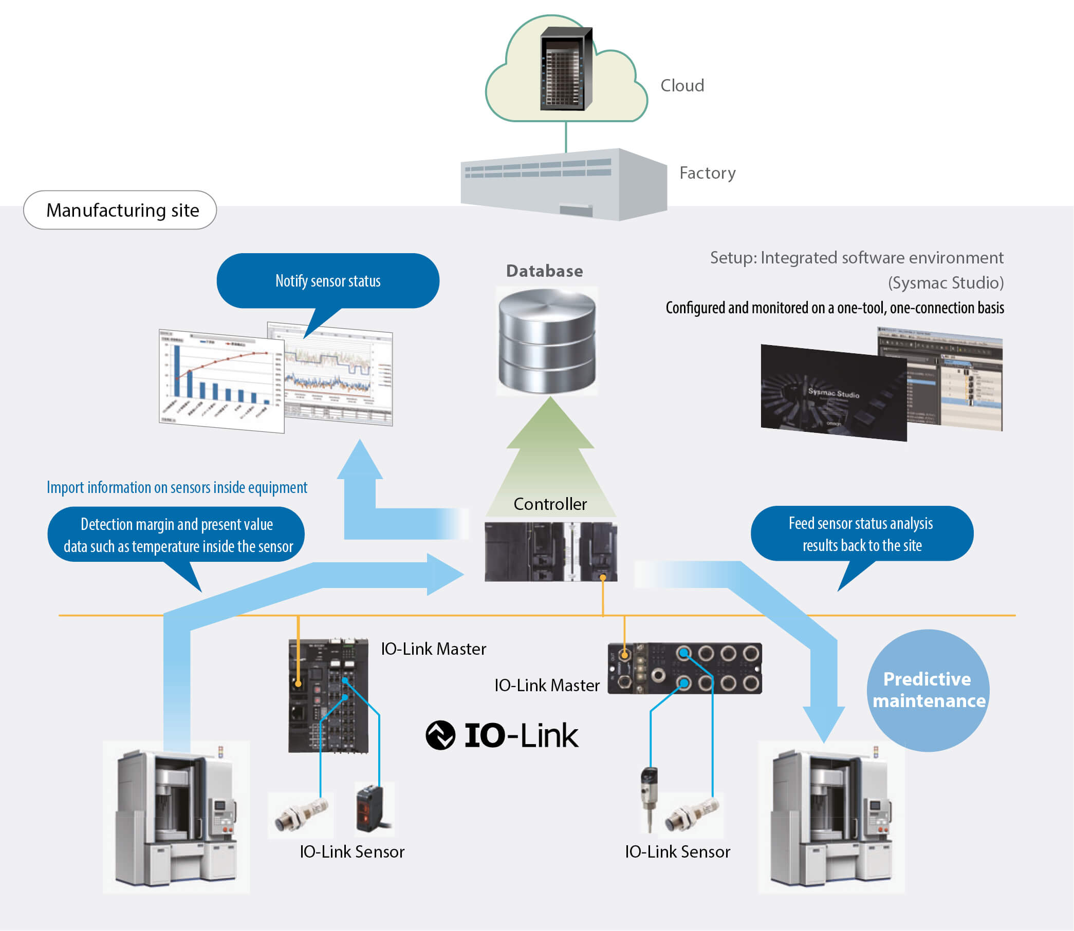 Подключение датчиков к контроллерам с помощью IO-Link Master позволяет отправлять необходимую для стабильной работы информацию на хост-устройства. Это позволяет отследить состояние и обнаружить неисправности датчиков, что, в свою очередь, способствует профилактическому обслуживанию оборудования и объектов. Вы также можете повысить производительность вашего предприятия, накапливая информацию в базах данных и передавая результаты анализа обратно на оборудование на объекте.